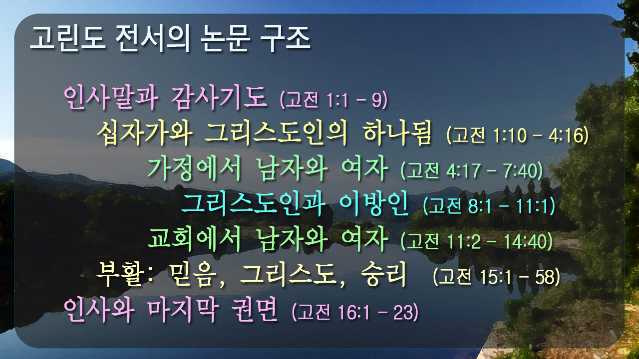 4. 그리스도 예수 안에서 너희에게 주신 하나님의 은혜로 말미암아 내가 너희를 위하여 항상 하나님께 감사하노니