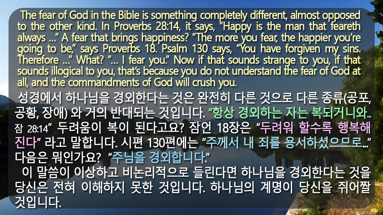13. 일의 결국을 다 들었으니 하나님을 경외하고 그의 명령들을 지킬지어다 이것이 모든 사람의 본분이니라