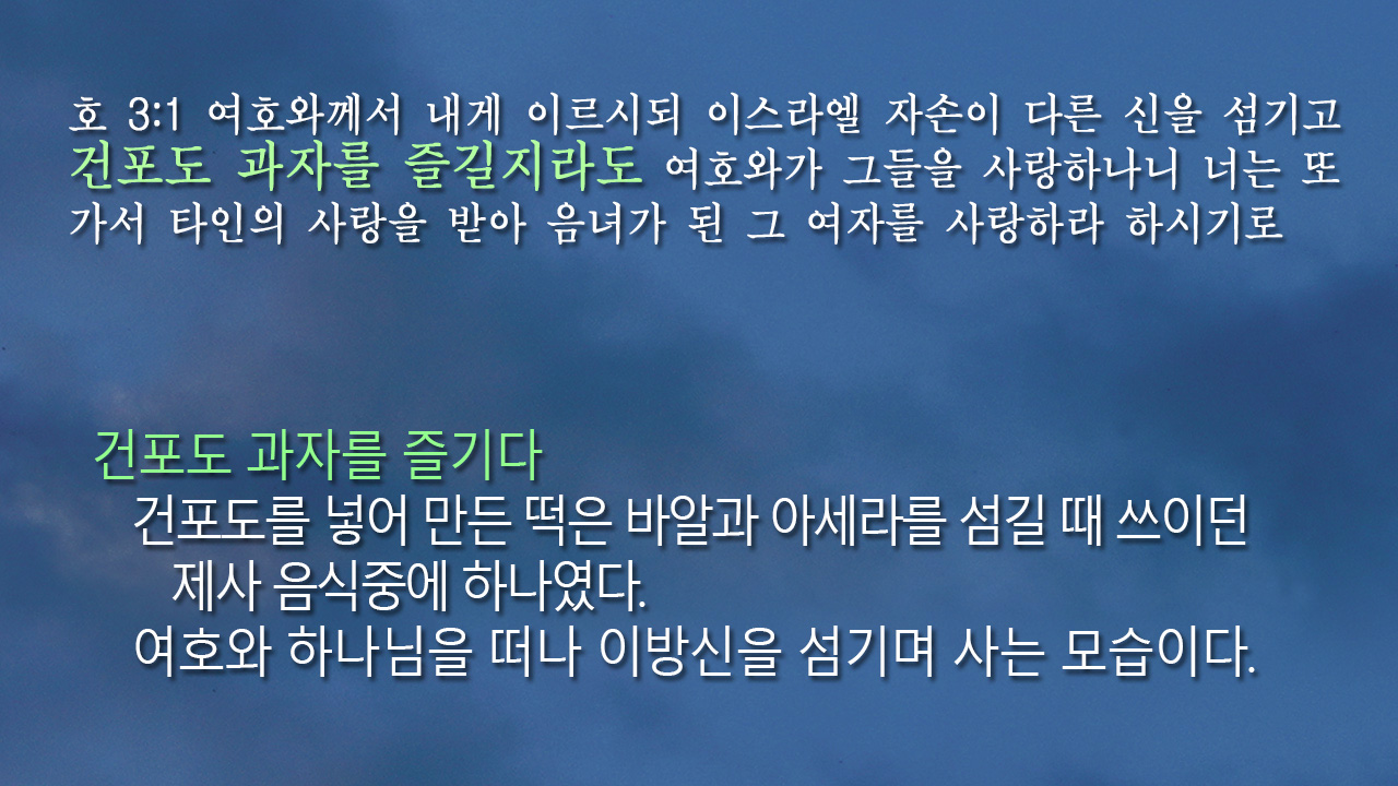 1. 여호와께서 내게 이르시되 이스라엘 자손이 다른 신을 섬기고 건포도 과자를 즐길지라도 여호와가 그들을 사랑하나니 너는 또 가
