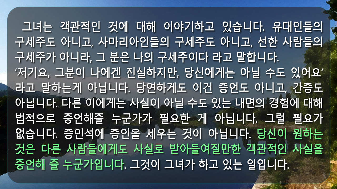 42. 그 여자에게 말하되 이제 우리가 믿는 것은 네 말로 인함이 아니니 이는 우리가 친히 듣고 그가 참으로 세상의 구주신 줄 앎이라 하였더라